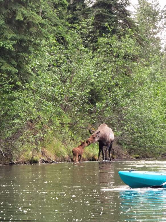 Finally, a few pics from a guided trip down Piledriver Slough two nights ago. Even though this little run is right next to the Richardson Highway, it always provides great wildlife viewing. This time down the group was able to watch a bull moose grazing on aquatic vegetation for a good while, and later had quite the thrill when a baby calf crashed out of the bushes followed shortly after by a concerned (and potentially very dangerous) mama moose. I ended up on one side of the pair, with the rest of the group on the other. Once reunited, the mother soothed her frightened baby, and eventually they walked off into the woods. One of the trip participants got some great shots of both events. (I do want to note that the perspective in the photos makes us look like we’re a lot closer to the moose than we actually were—other than when they came running out of the bushes. Significant distance is recommended.) Thanks to Jennifer Howell for letting me share them here.