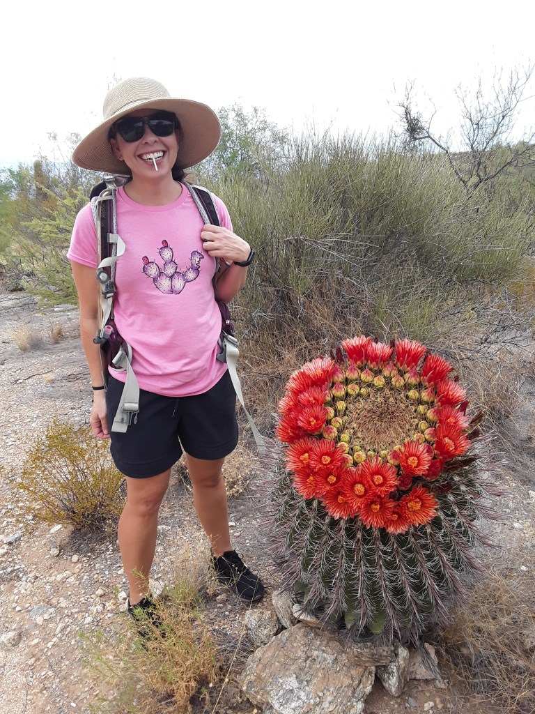 Fixating on Jackalopes…Krissy in Saguaro NP next to Fishhook Barrel Cactus wearing Purple Prickly Pear T-shirt…‘Model Ts’