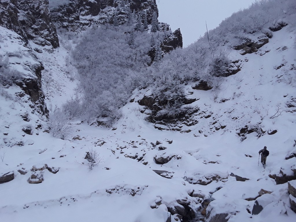 Sean and I drove down south a ways to check out Gunnysack Creek. I’d never heard of the place, but thanks to Sean’s penchant for dreaming up out of the way, and often ambitious itineraries, I got to go see something new. Early in November things were actually eerily warm, so the creek wasn’t nearly as frozen up as it might have been. We decided to do a little adventuring anyway, and spent a pleasant afternoon post-holing along the creek bank, and hopping back-and-forth across questionably stable ice bridges. Was a beautiful little canyon, and quite unlike anything else in that area. Finished the evening with a quick stop at the Delta Brewery. A successful day and a good scouting mission for future forays into the area.