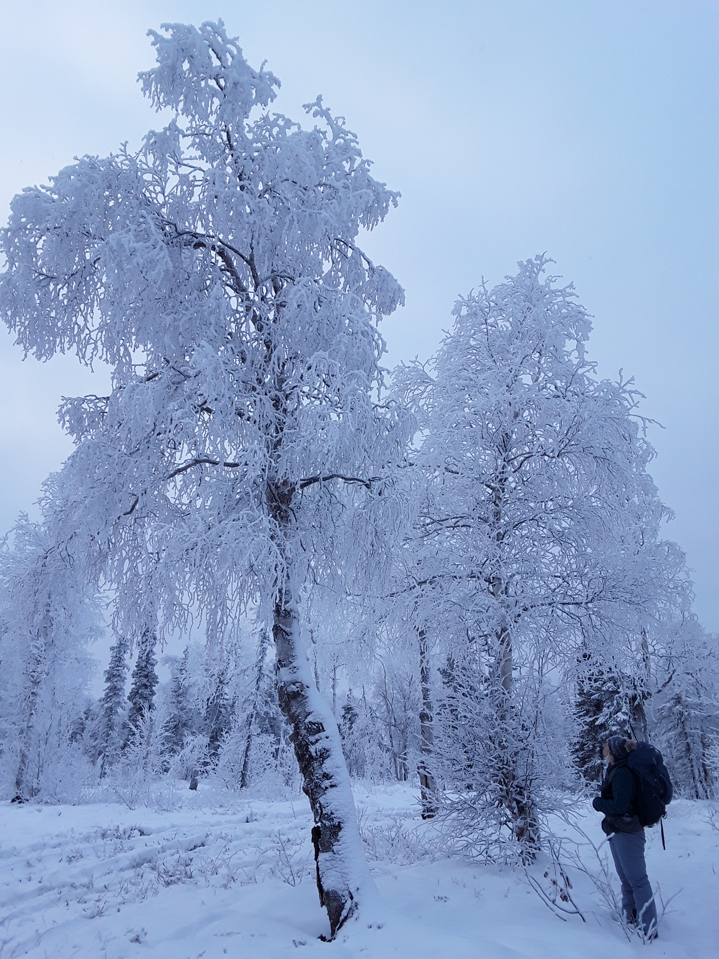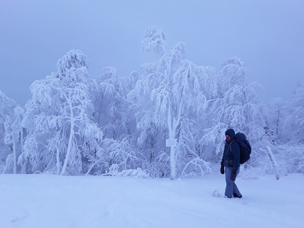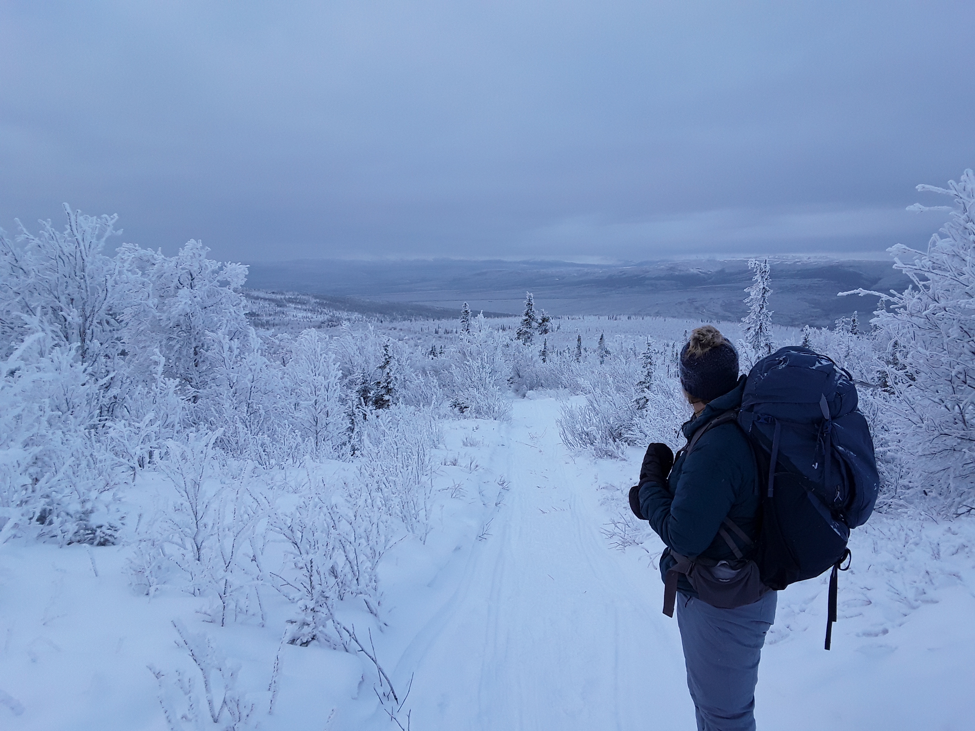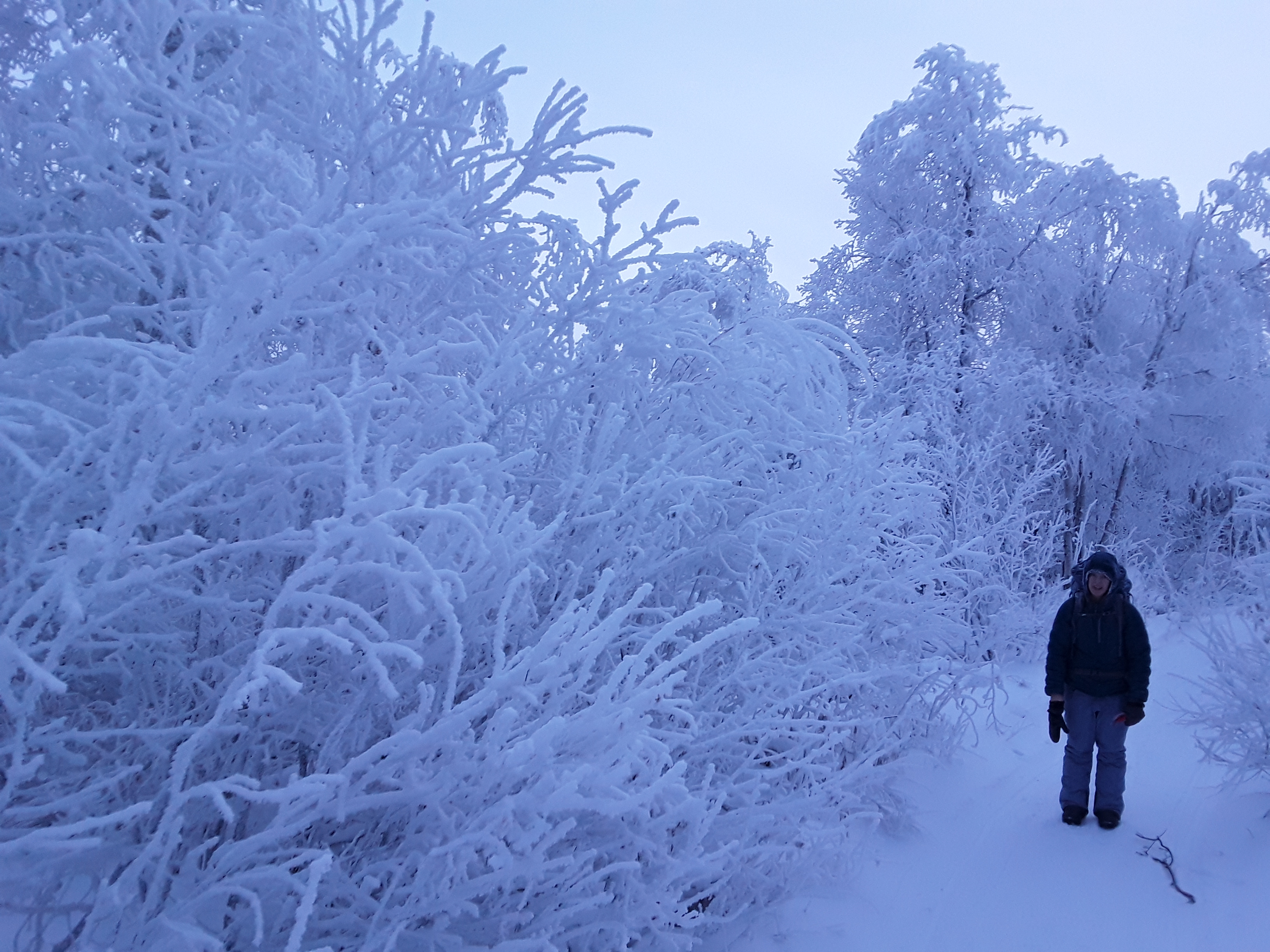 Thankfully, Melissa and I didn’t have to worry about any of that on this trip. We considered ourselves quite ‘lucky’ to have a steady -5° the whole time we were out there, and only a mild breeze along ‘Windy Gap’ and the top of the dome. The route itself is a TOUGH 10-miles or so. Lots of elevation gain and loss, plus carrying a backpack, wearing all your winter gear, and walking in the snow. Along with all this you have to try and keep some water usable so you might have a little sip now and again, but only when you stop and dig it out of your pack, because otherwise the bottle will be frozen shut along with half its contents. You will overheat regularly while on the move, and instantly feel the shivers coming on if you stop for more than two minutes. On the way in, you immediately drop almost 1000’, then climb it all back plus some, then drop right back down again. On the way back, it’s climb, descend, and climb, and climb, then scream profanities to the birches, maybe weep, and then climb some more. The last mile might have been one of the more demoralizing (but funny, if you can laugh at your own weakness) experiences I’ve had in recent years.