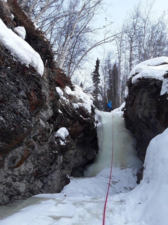 Pat used to work for NOVA as a glacier guide, and climbing, ice, rock, etc., is his passion. Last winter, he came up this way to help oversee a couple of ice climbing trips for the program, and I’ve always wanted to join him on a more involved excursion than the easy waterfall we took the clients on. We woke up the next morning to a heavy snowstorm outside, but loaded up the gear and drove out towards the Matanuska Glacier. About halfway through the drive, the roads and sky cleared up, and warm(ish) weather made for perfect conditions for a climb up Kid’s Corner, a multi-pitch series of frozen waterfalls in a small side canyon up Caribou Creek, the put-in for river trips down the Matanuska River, where I guided for several summers.